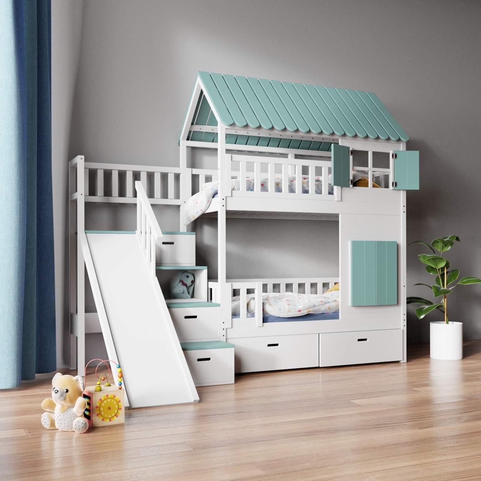 Køjeseng med trapper, rutsjebane og skuffer fra NBT er en drøm for mange generationer af børn, som nu kan gå i opfyldelse med den monterede rutsjebane. Hele konstruktionen er designet på en utrolig præcis og børnesikker måde, så to børn trygt kan sove og lege på køjesengen, både på øverste og nederste etage. Dette er en behagelig soveplads, men også et sted at udforske og lege i deres eget værelse. Den er lavet af fyrretræ, som er et fremragende byggemateriale, da det er holdbart og solidt. Flere farver at vælge imellem og husets form gør det til en perfekt kombination for alle børn, ikke kun drenge, men også piger. Det kombineres sømløst med sikkerhed og funktionalitet i konstruktionen. Hele projektet er gennemtænkt ned til mindste detalje. Med den farvepalet, vi tilbyder, vil køjesengen også passe perfekt til børneværelsets interiør. I denne model er der en rækværk for at forhindre fald, og det fungerer også som en dekorativ del af hele sengen og giver en balkonfølelse. Det er den perfekte løsning for hvert barn, der sætter pris på en hyggelig atmosfære og komfortabel hvile lige fra eventyrverdenen. Køjesengen med trapper, rutsjebane og skuffer er helt lavet af massivt fyrretræ fra certificerede plantager, hvilket betyder, at vi værner om miljøet og naturen.